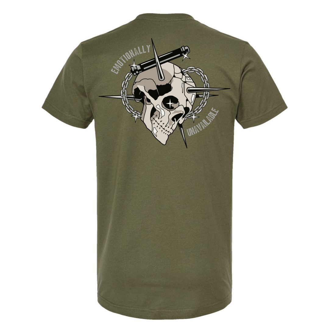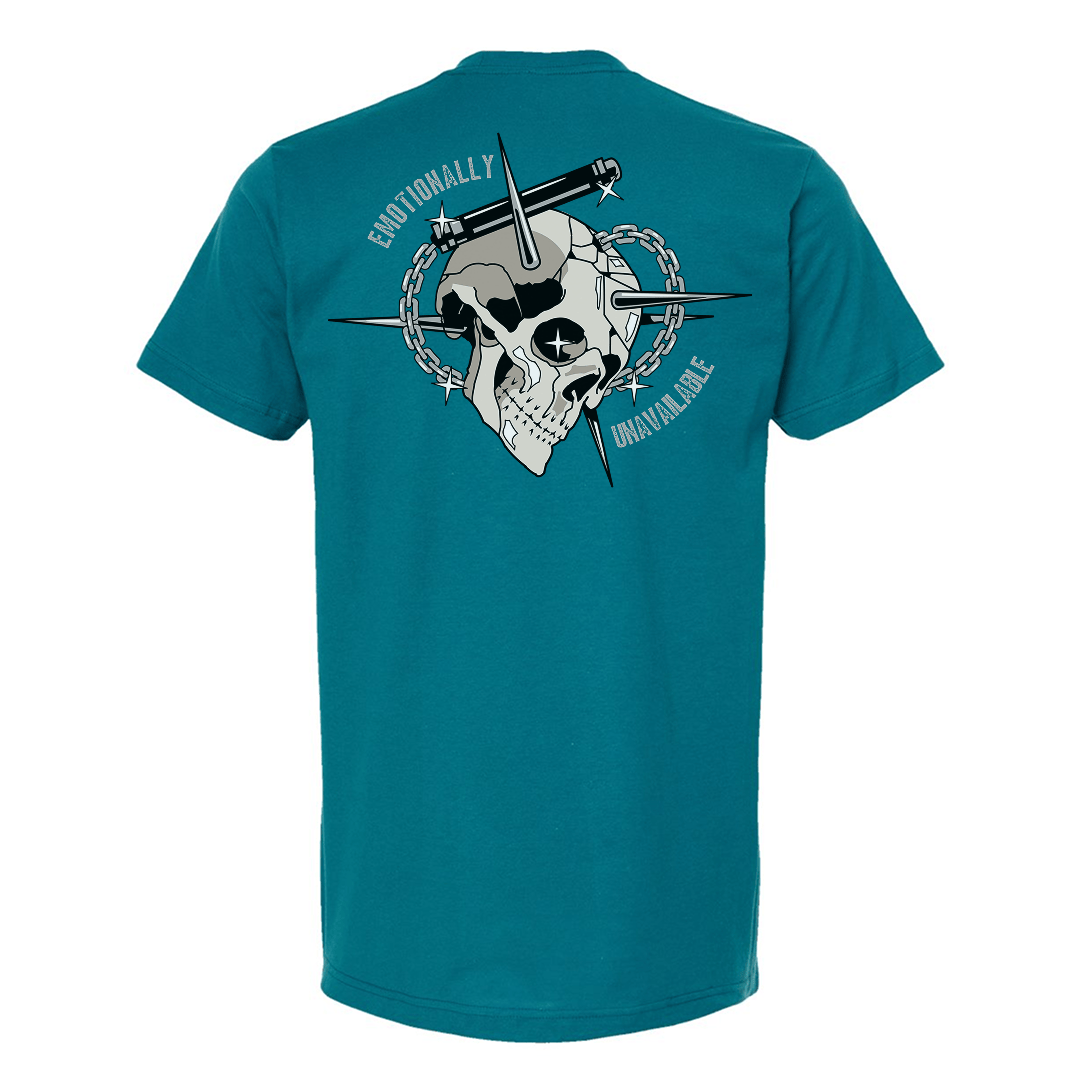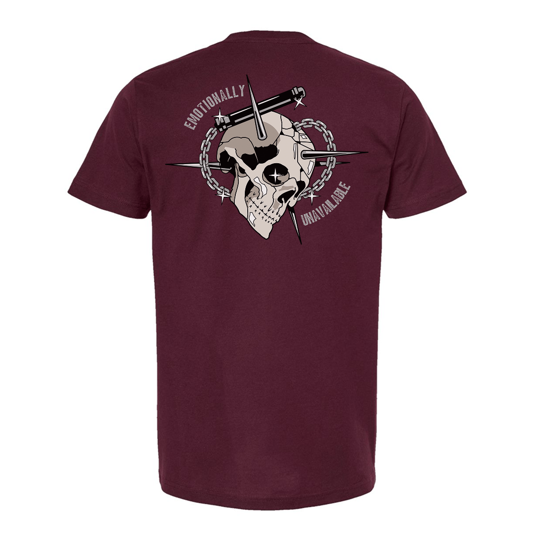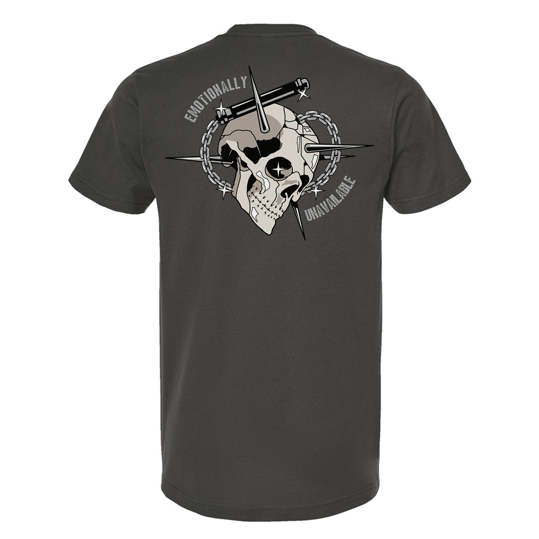 The Emotionally Unavailable design features bold tattoo-style artwork of a cracked skull bound by chains and pierced with sharp steel, symbolizing guarded energy, hard-earned boundaries, and a heart that doesn’t open easily anymore.