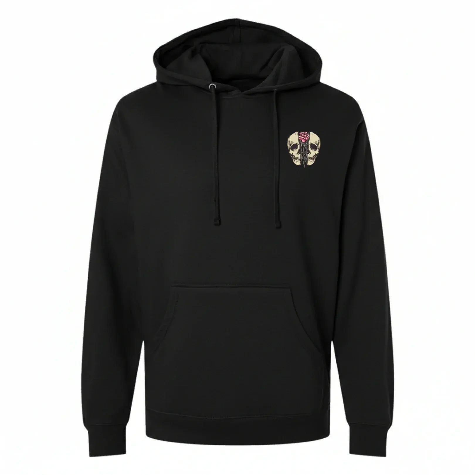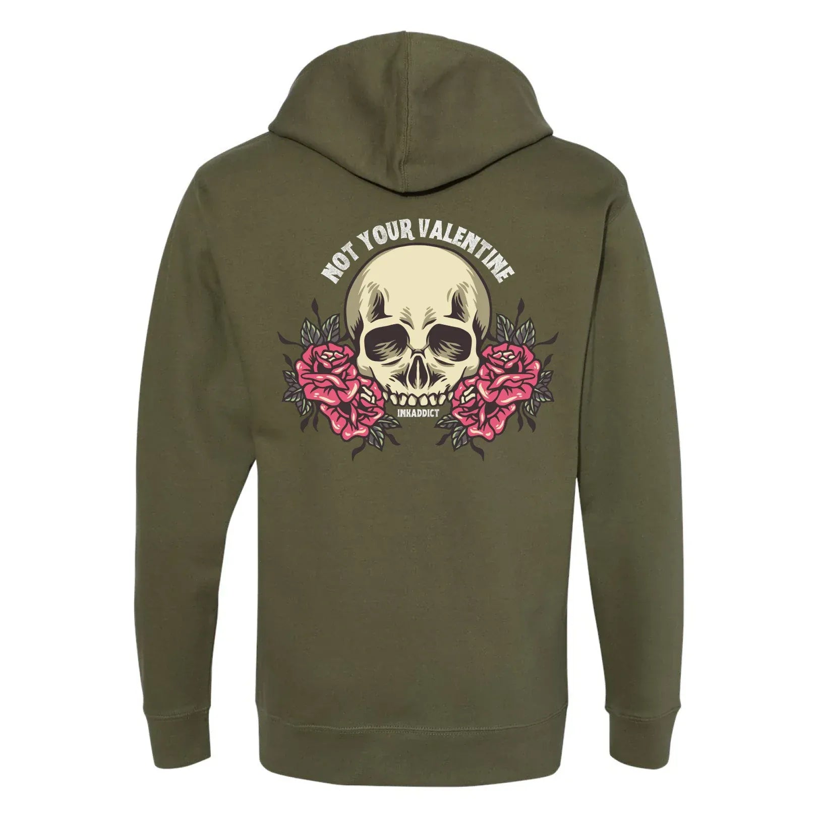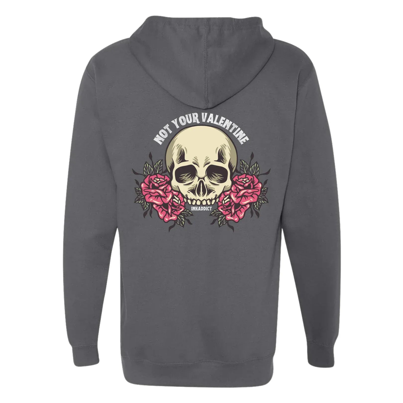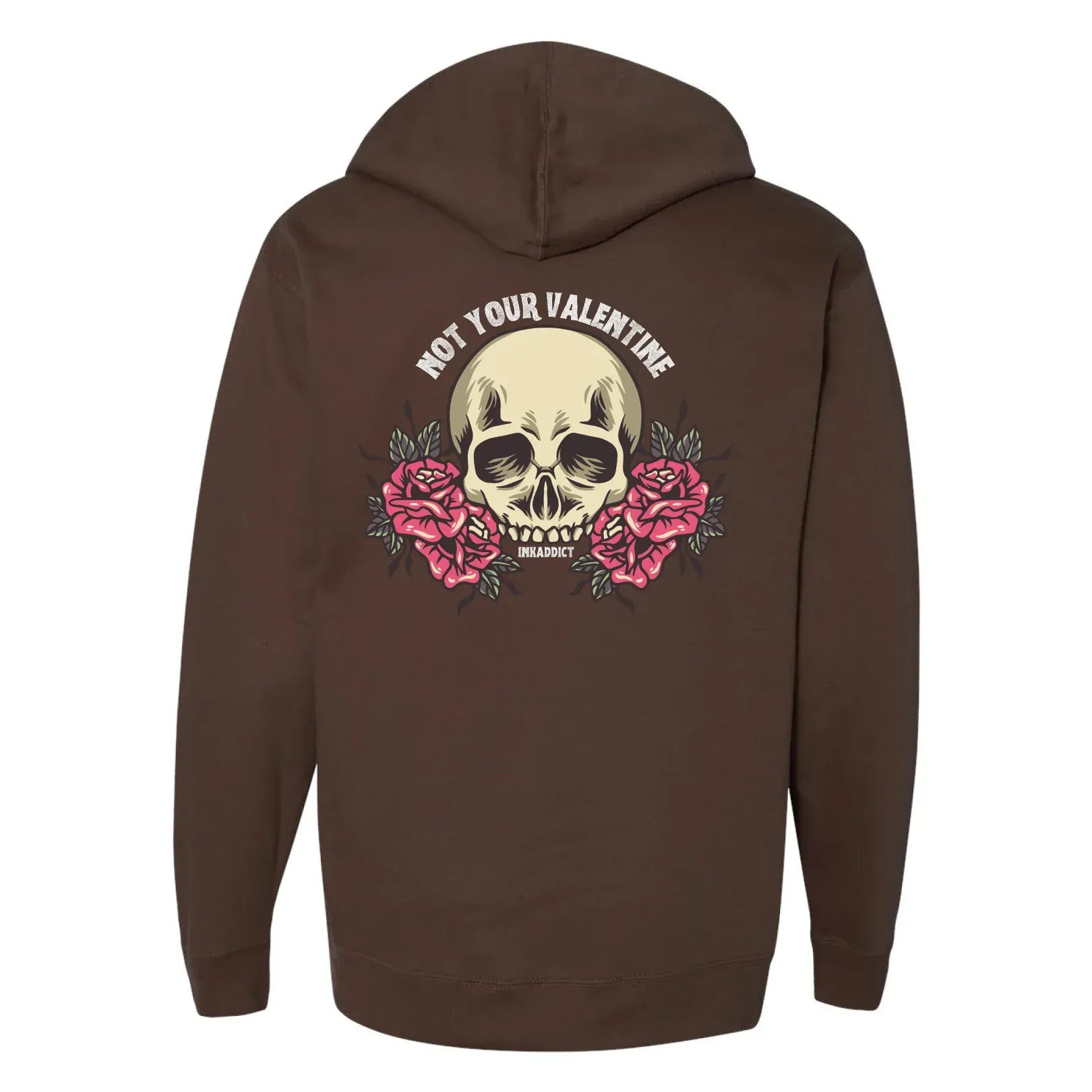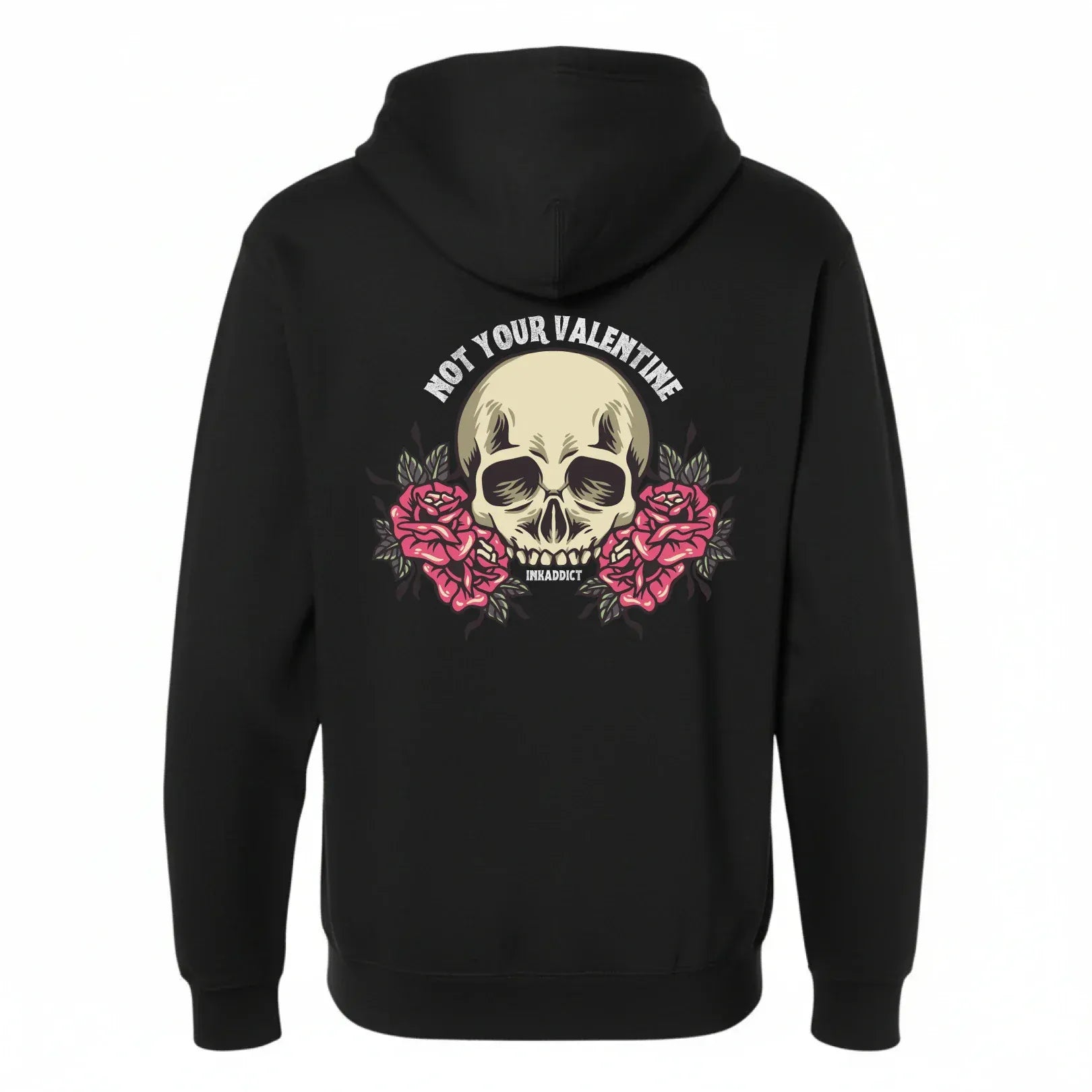 Love isn’t always hearts and fairytales, and this one makes that crystal clear. The Not Your Valentine design features bold tattoo-style artwork of a skull framed by blooming roses, blending beauty with bite. It’s the perfect balance of soft visuals and sharp truth.