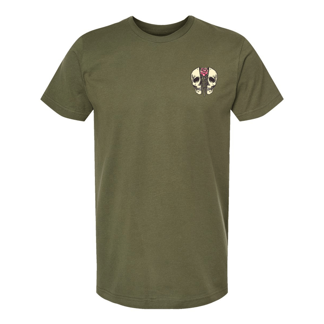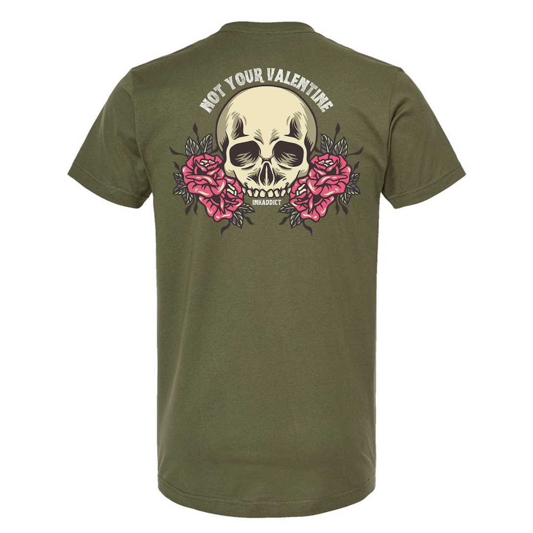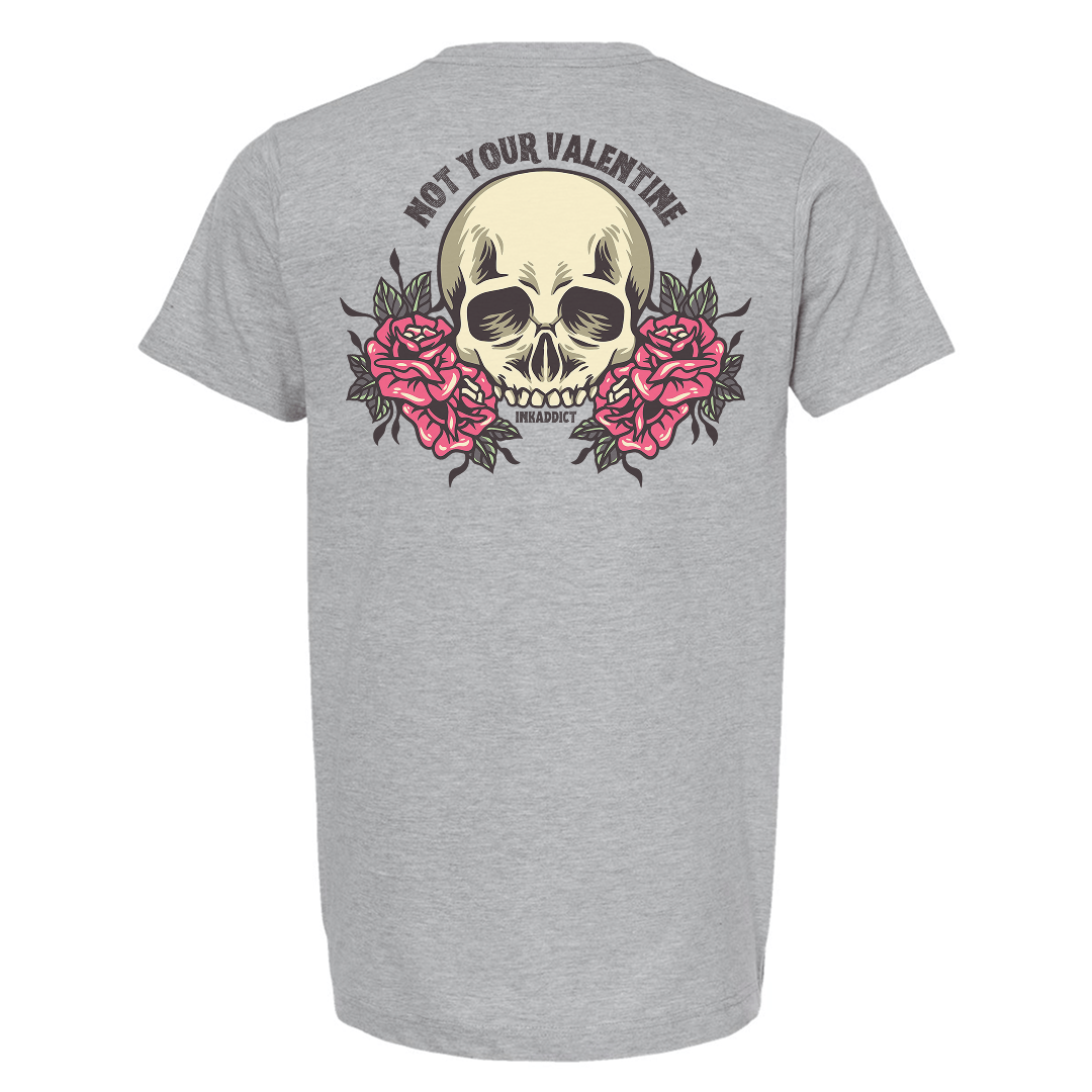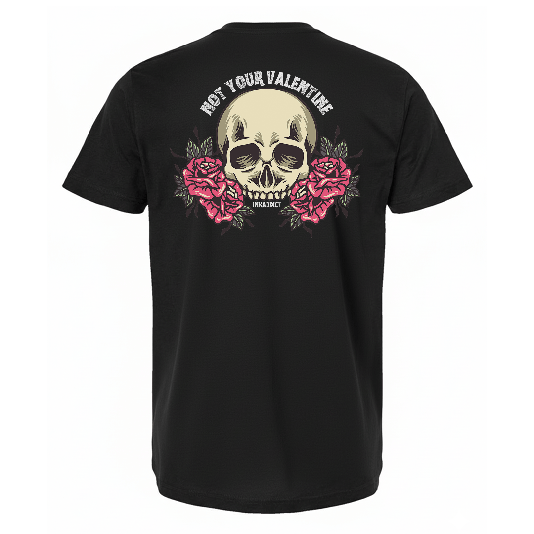 Love isn’t always hearts and fairytales, and this one makes that crystal clear. The Not Your Valentine design features bold tattoo-style artwork of a skull framed by blooming roses, blending beauty with bite. It’s the perfect balance of soft visuals and sharp truth.