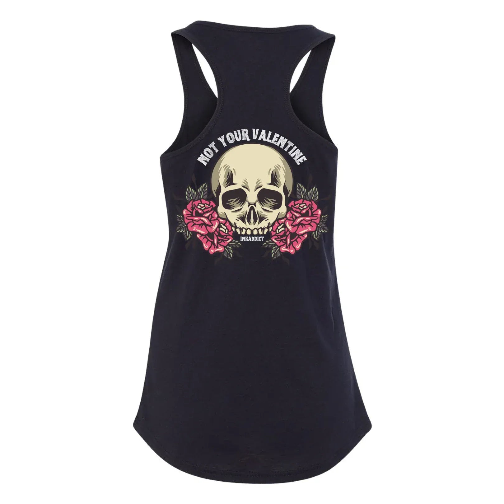 Love isn’t always hearts and fairytales, and this one makes that crystal clear. The Not Your Valentine design features bold tattoo-style artwork of a skull framed by blooming roses, blending beauty with bite. It’s the perfect balance of soft visuals and sharp truth.