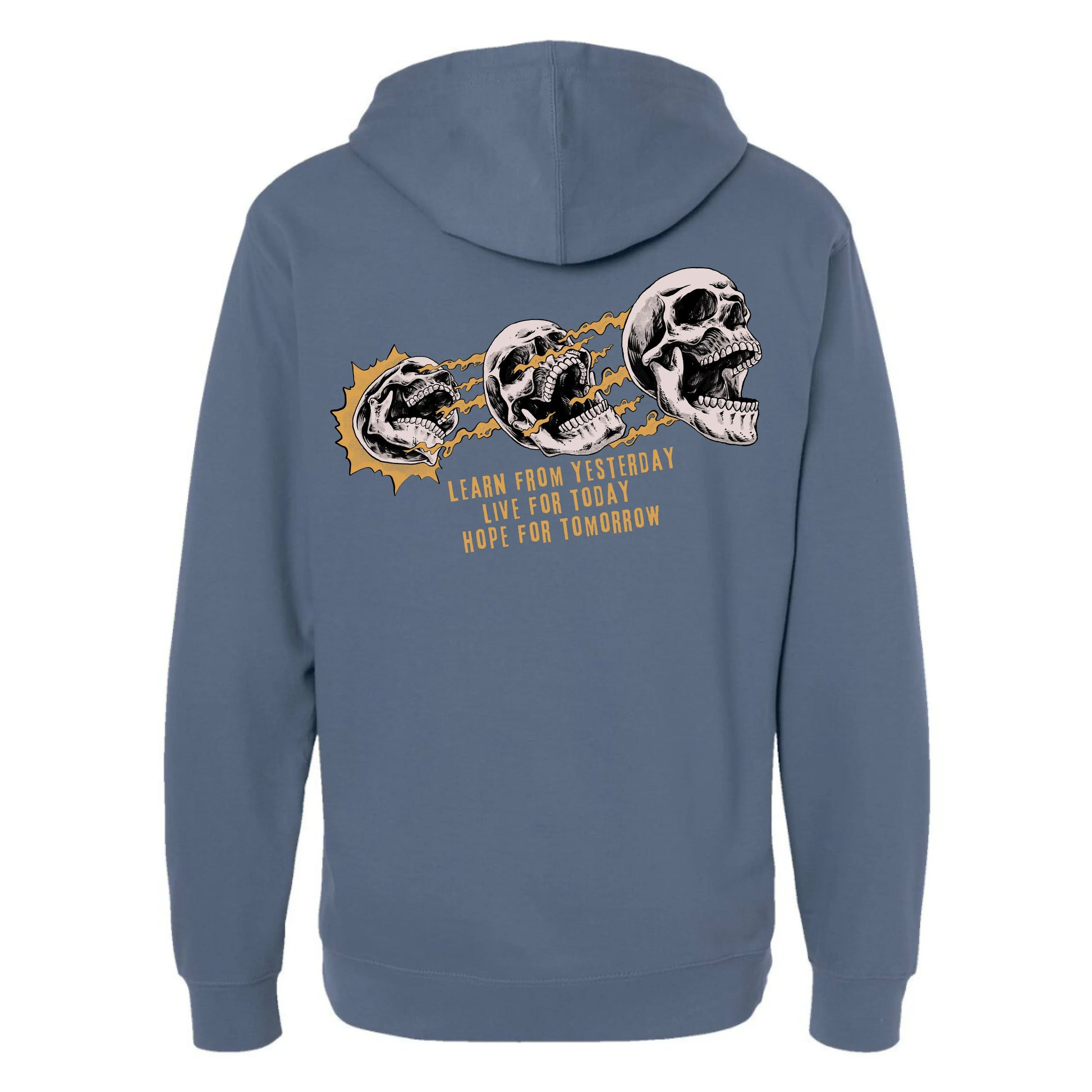Three skulls. One message. This hoodie isn’t just about the art—it’s a reminder to keep moving forward. “Learn from yesterday. Live for today. Hope for tomorrow.” Heavy truth, killer design. Soft AF fleece keeps you warm while the bold back print speaks for itself. Perfect for those who wear their mindset as loud as their ink.